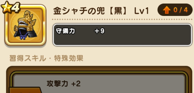 ドラクエウォークの防具「金シャチの兜【黒】」の評価や習得スキル・特殊効果をまとめています。