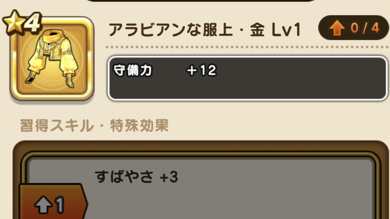 アラビアンな服上・金の性能と習得スキル