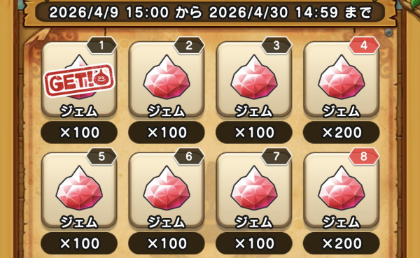![]() | ジェム×13640個(6章まで) カウントダウンログボ:1500個 イベントログボ(第1弾):1000個 イベントログボ(第2弾):1000個 イベントログボ(第3弾):1000個 序章クエストクリア:100個 イベントクリア(1章):550個 イベントクリア(2章):650個 イベントクリア(3章):550個 イベントクリア(4章):600個 イベントクリア(5章):600個 イベントクリア(6章):450個 ルートクリア報酬(2章):150個 ルートクリア報酬(3章):150個 影の石版報酬(6個):100個 アルスの絆レベル上げ報酬:200個 マリベルの絆レベル上げ報酬:200個 ガボの絆レベル上げ報酬:200個 メルビンの絆レベル上げ報酬:200個 アイラの絆レベル上げ報酬:200個 強敵「炎の巨人」討伐報酬:200個 強敵「タイムルーパー」討伐報酬:200個 ギガモン「かみさま」討伐報酬:500個 図鑑埋め(12体):240個 ちいさなメダルシーズン報酬:1000個 リッカの宿屋シーズン報酬:900個 時渡りの剣士レベル到達報酬:合計900個 時渡りの剣士紹介クエストクリア:300個 時渡りの剣士ダーマ神殿クリア:合計600個 カジノシーズン8報酬(前半):900個 記念パス購入:合計3000個 ※要課金 ※上記のジェム合計に含めていません |