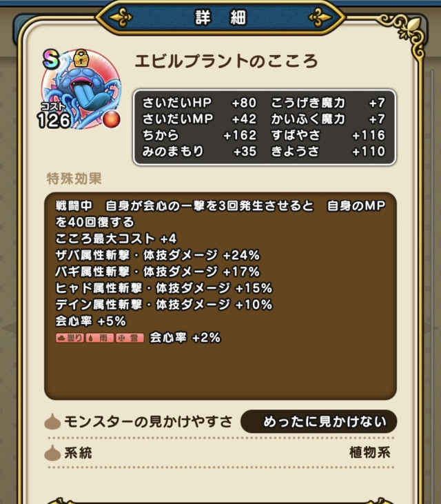こころコストを600以下にするとエビルプラントの乱入率がアップします。さらに、天候が雨/雪なら更に上昇「天地雷鳴士」のウォーカーズスキルで天候を変えるのもあり。