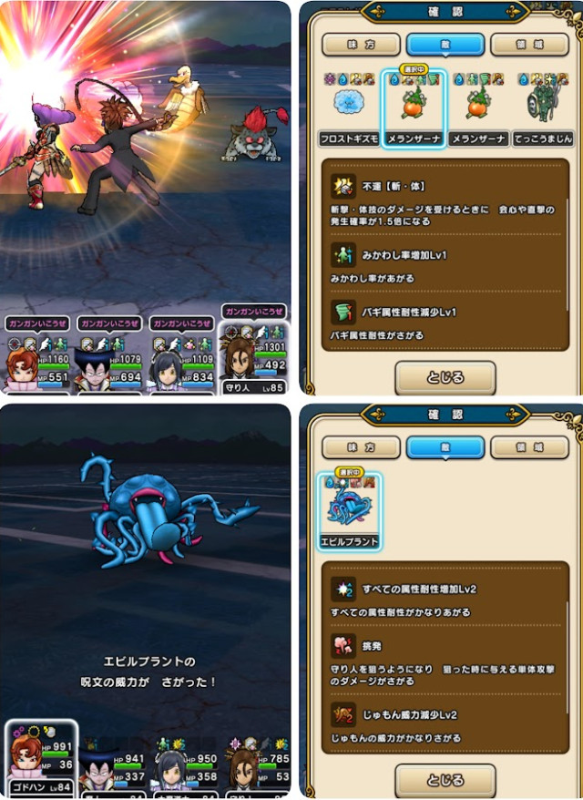 ・エビルプラントはまじんオノで呪文攻撃減入りやすいんで、烈鎚運用してるなら継承しとくと乱入マヒャドの被ダメ抑えたり反撃で与ダメ補助にも