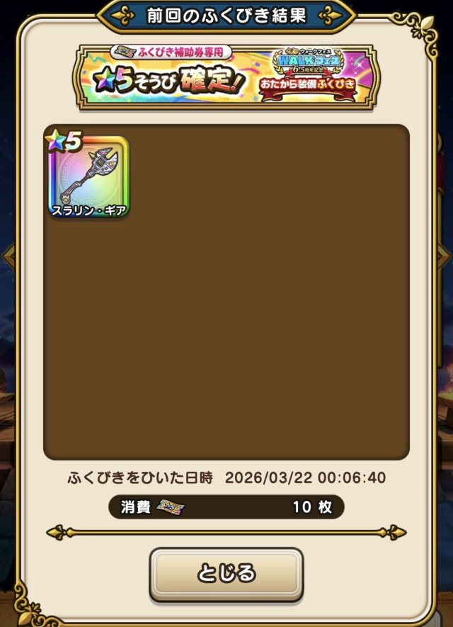 ![]() | ★5ぶき確定6周年記念おたから装備ふくびき補助券×10枚 神の軍団全地方クリア報酬:10枚 |