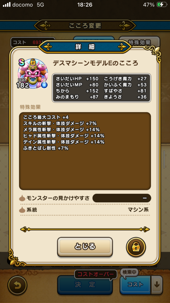 ドラクエウォークの「デスマシーンモデルEのこころ」の性能・ステータス順位、必要個数を掲載!心珠ポイントへの交換効率や出現場所などもまとめていますので参考にしてください。
