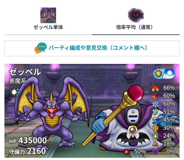 あんま使われてなさそうですが、平均倍率が2体の通常倍率の平均に全属性耐性がかかった数値になってますね。全属性耐性はゼッペルだけなので、ゼッペルの全属性耐性倍率ときとうしの通常倍率の平均が正しいと思います。メラなら(130%✕0.6+70%)÷2=74%?