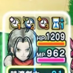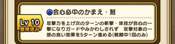 | Lv10 | 会心必中のかまえ・刻 / 消費MP 最大MP10% 攻撃力を上げ次のターンの斬撃・体技が会心の一撃になりガードやみかわしされず 攻撃対象の一部の良い効果を5ターン進める(戦闘中1回のみ) |
