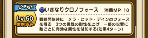 | Lv50 | いきなりクロノフォース / 消費MP 10 戦闘開始時に メラ・ヒャド・デインのフォースを得る 3つの属性の耐性を上げ 一部の攻撃に敵ごとに有効な属性を付加する(効果4ターン)【いきなり】 |