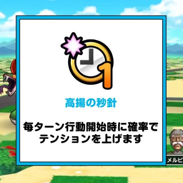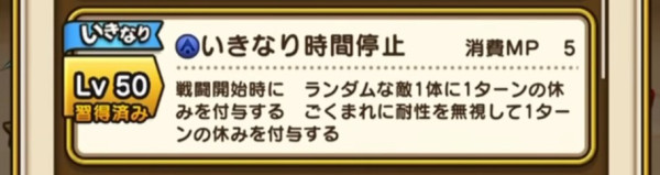 | Lv50 | いきなり時間停止 / 消費MP 5 戦闘開始時に ランダムな敵1体に1ターンの休みを付与する ごくまれに耐性を無視して1ターンの休みを付与する【いきなり】 |