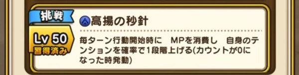 | Lv50 | 高揚の秒針 / 消費MP 最大MP1% 毎ターン行動開始時に MPを消費し 自身のテンションを確率で1段階上げる(カウントが0になった時発動)【挑戦】 |