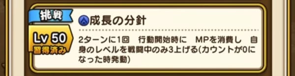 | Lv50 | 成長の分針 / 消費MP 最大MP5% 2ターンに1回 行動開始時に MPを消費し 自身のレベルを戦闘中のみ3上げる(カウントが0になった時発動)【挑戦】 |