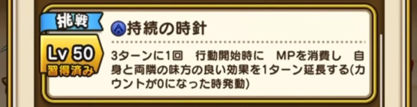 | Lv50 | 持続の時針 / 消費MP 最大MP3% 3ターンに1回 行動開始時に MPを消費し 自身と両隣の味方の良い効果を1ターン延長する(カウントが0になった時発動)【挑戦】 |