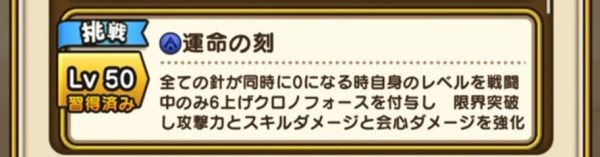 | Lv50 | 運命の刻 / 消費MP 最大MP10% 全ての針が同時に0になる時自身のレベルを戦闘中のみ6上げクロノフォースを付与し 限界突破し攻撃力とスキルダメージと会心ダメージを強化【挑戦】 |