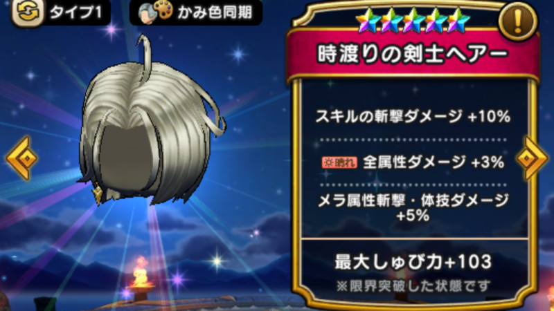ドラクエウォークの防具「時渡りの剣士ヘアー」の評価や習得スキル・特殊効果をまとめています。