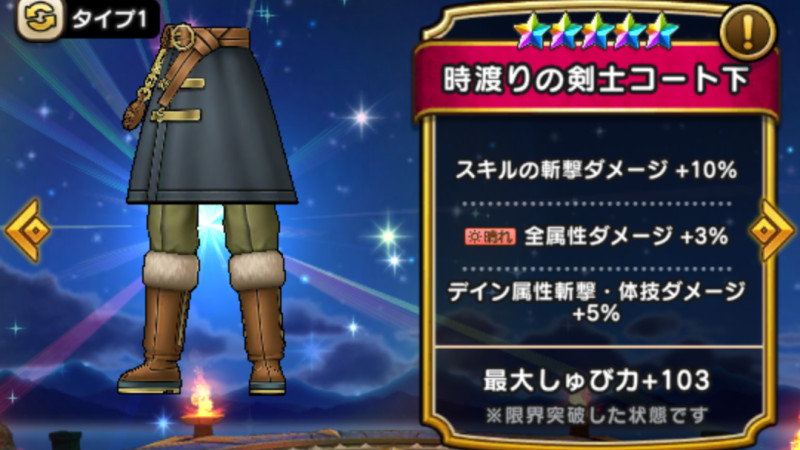 ドラクエウォークの防具「時渡りの剣士コート下」の評価や習得スキル・特殊効果をまとめています。