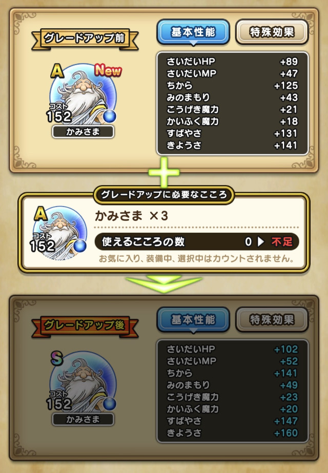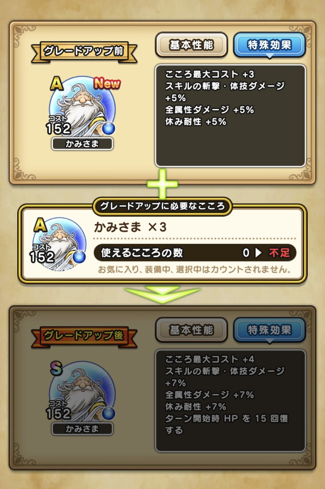 斬撃・体技・ブレスで高火力、足速い(すばやさ高い)、貴重な????系特効、毎ターンHP回復77あり等、呪文以外の全方向で使いやすいハイスペック攻撃型こころに強化できます。