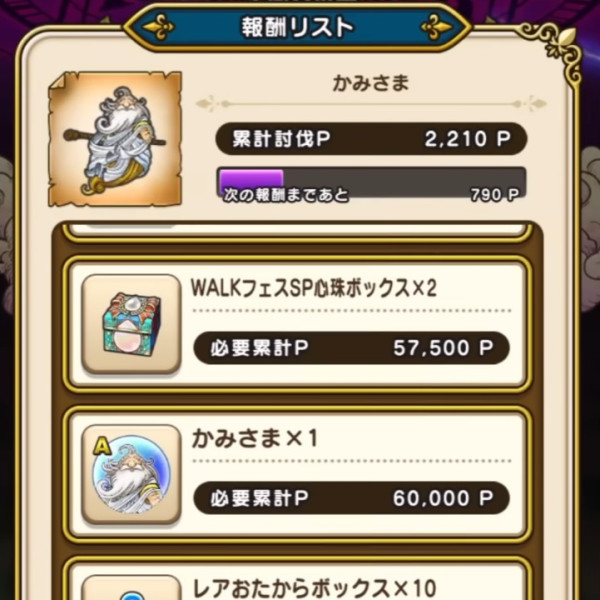 ドラクエウォークのギガモン「かみさまのこころ」の覚醒までの無理のない目安(ペース)と1日に稼ぐべき討伐P&順位ボーナスをまとめています。の宝珠はどこ、何個必要か集め方も掲載しています。