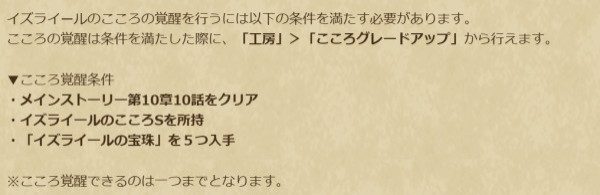 | ※覚醒できるのは1個だけ ※ランキング非開催期間も集められる ※覚醒の条件 ・メインストーリー10章10話クリア ・イズライールのこころSを所持 ・イズライールの宝珠5個 →交換所でかけらと交換(1回50個) |