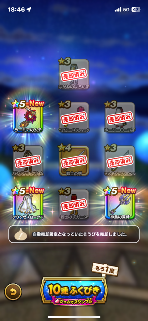 グリ爪にジェム使うか迷いましたが、すばやさは円月輪とラー鞭で、延長は最悪天杖でいいかと思い、次の延長可能武器を期待していたところ、翼斧が出て取りました。