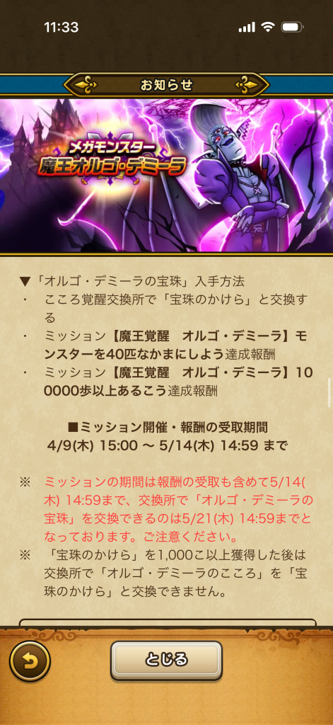 そういや前ハーゴン復刻の時に犠牲者がいたけど宝珠交換期間とメガモン出現期間はイコールじゃ無いから注意な、5月21日まで居ると勘違いしないように