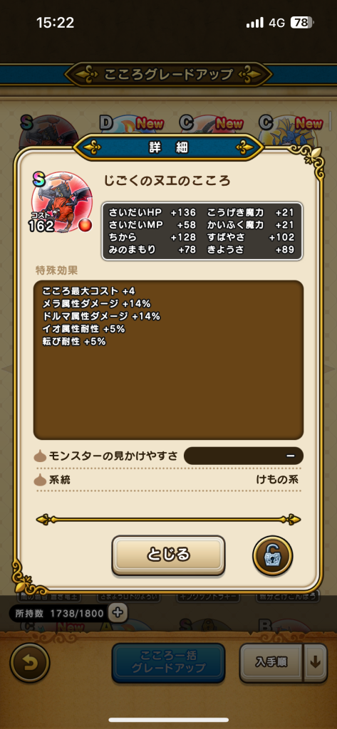 素で直撃や超会心や特殊気合いためとかないから、火力は正直もう時代遅れに入ったね。あとはレベルアップという領域が今後来る領域に打ち勝って置物として入れたくなるシーンがあるかどうかが寿命を決める。