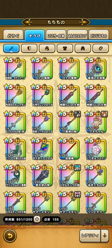 実装時にジェム使って取ったのは、円月輪、銀河剣、ラー鞭、メタキン大剣、グリ牙、玉座