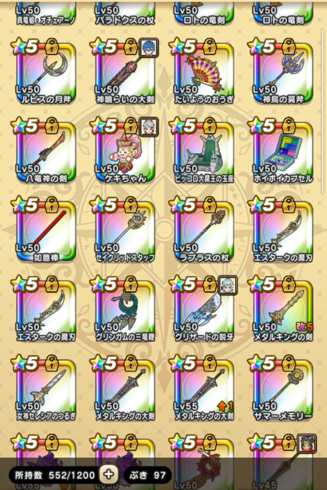 実装時に無ジェムで取れたのは、飛天書、鉄球、セティア棍、如意棒、神喰剣、月斧、ロト竜剣、ヘパ斧、パラ杖