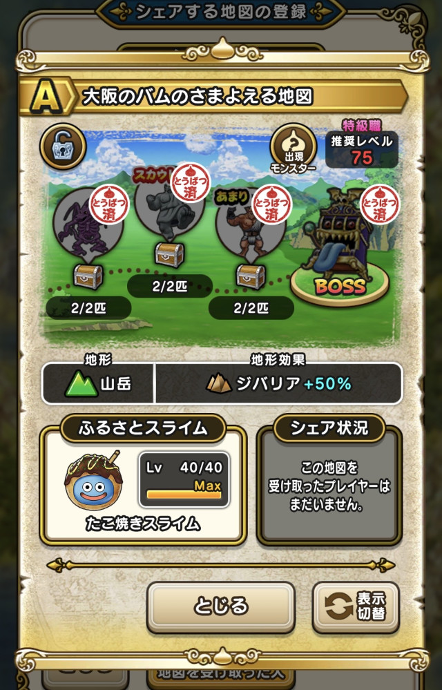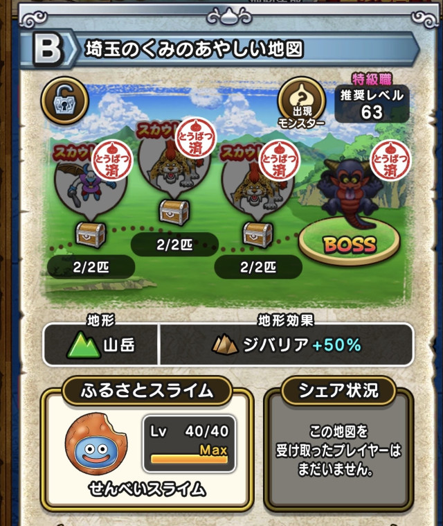ドラクエウォークの宝の地図をシェア・入手するためのフレンド募集掲示板です。シェア時は宝の地図の内容(グレード、BOSS、お宝モンスター、都道府県)と自分のIDを記載してください。