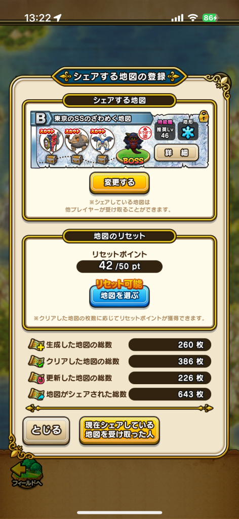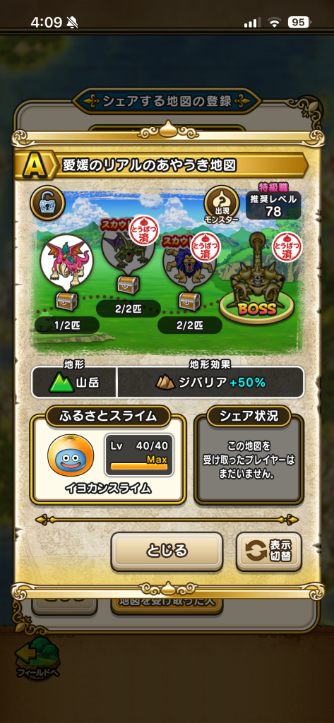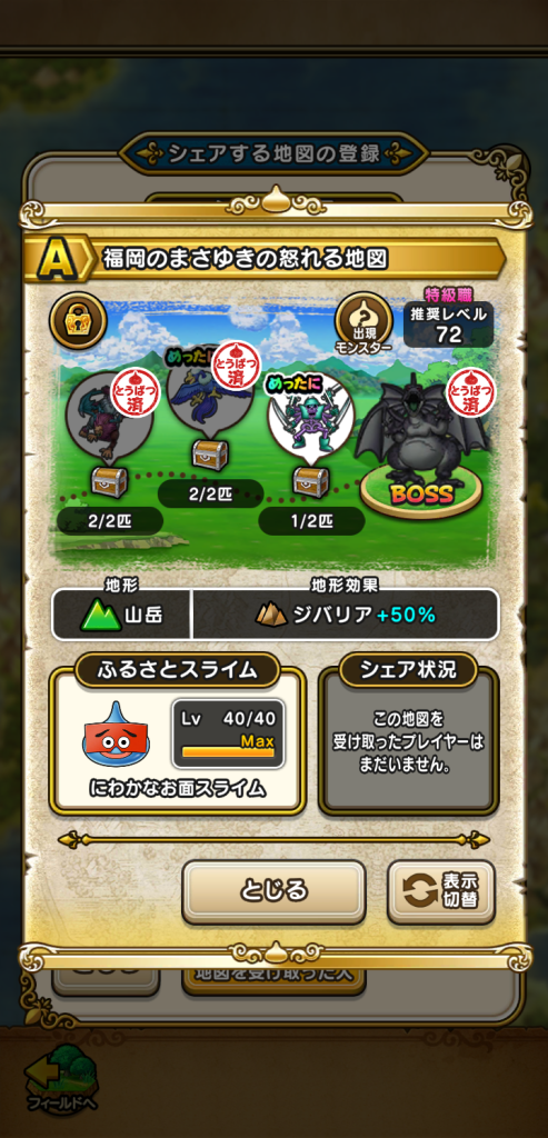 ドラクエウォークの宝の地図をシェア・入手するためのフレンド募集掲示板です。シェア時は宝の地図の内容(グレード、BOSS、お宝モンスター、都道府県)と自分のIDを記載してください。