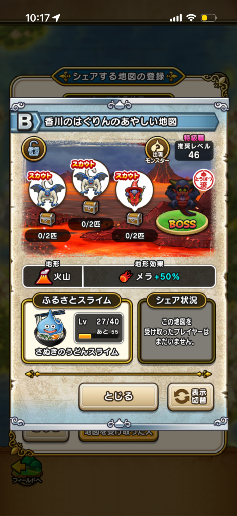 ドラクエウォークの宝の地図をシェア・入手するためのフレンド募集掲示板です。シェア時は宝の地図の内容(グレード、BOSS、お宝モンスター、都道府県)と自分のIDを記載してください。