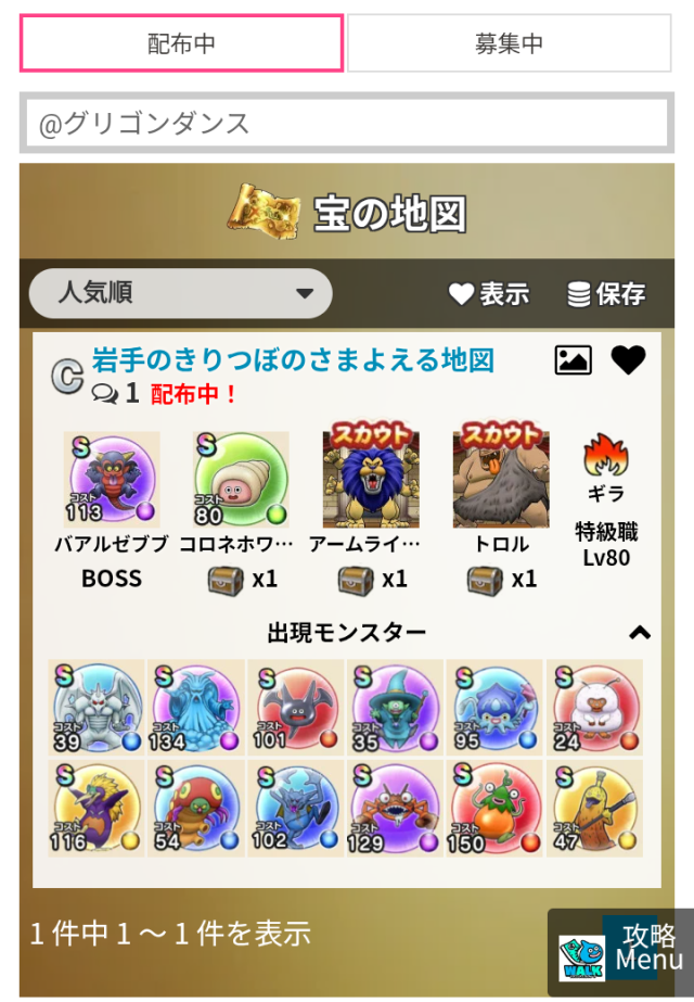 宝の地図一覧で、『@グリゴンダンス』で検索。配布中は1件しかヒットしなかったけど。