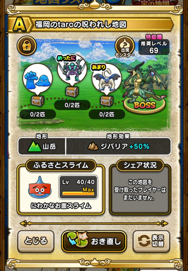 ドラクエウォークの宝の地図をシェア・入手するためのフレンド募集掲示板です。シェア時は宝の地図の内容(グレード、BOSS、お宝モンスター、都道府県)と自分のIDを記載してください。