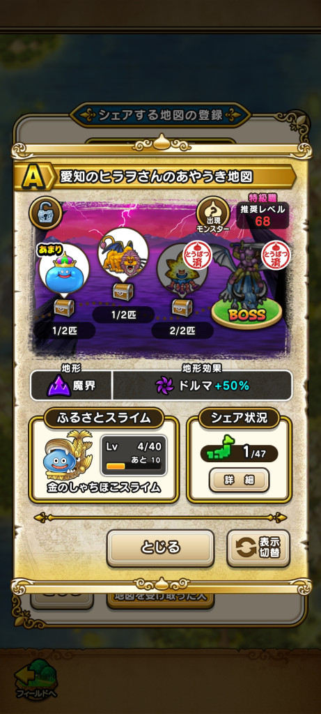 ドラクエウォークの宝の地図をシェア・入手するためのフレンド募集掲示板です。シェア時は宝の地図の内容(グレード、BOSS、お宝モンスター、都道府県)と自分のIDを記載してください。