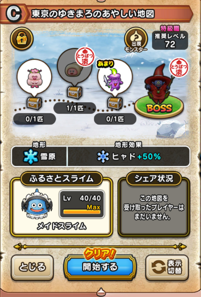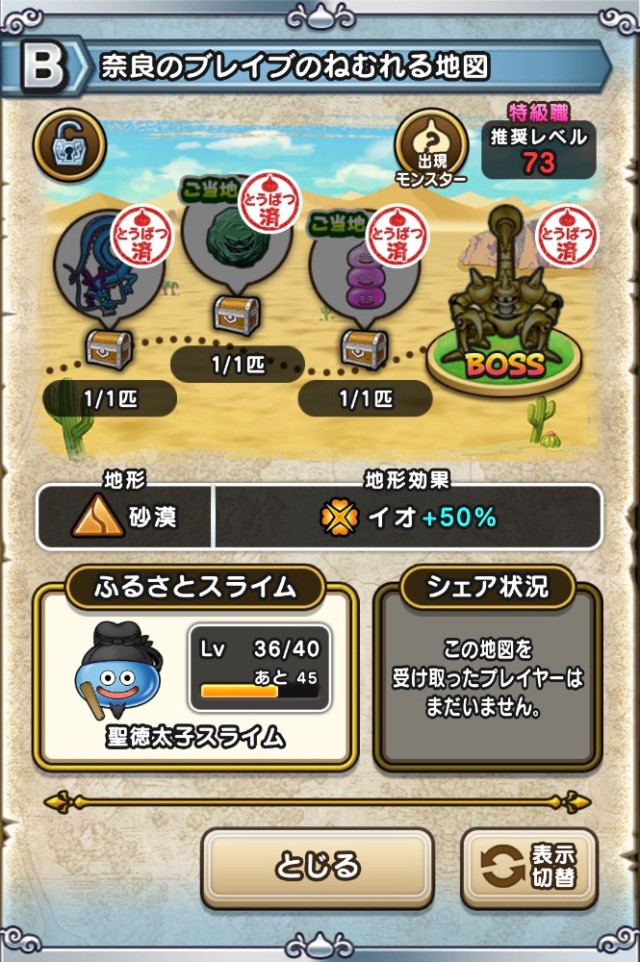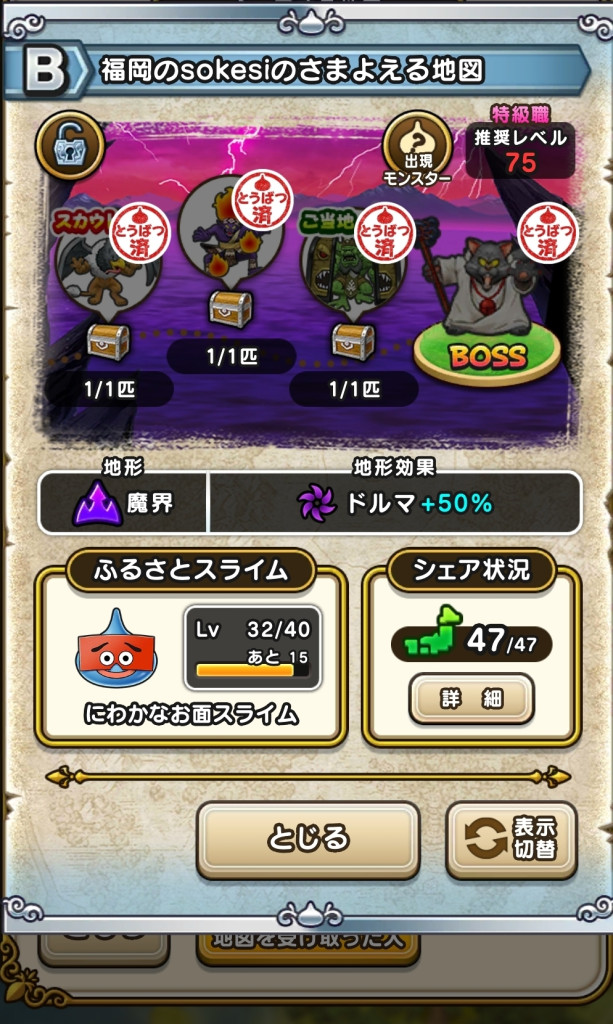 ドラクエウォークの宝の地図をシェア・入手するためのフレンド募集掲示板です。シェア時は宝の地図の内容(グレード、BOSS、お宝モンスター、都道府県)と自分のIDを記載してください。