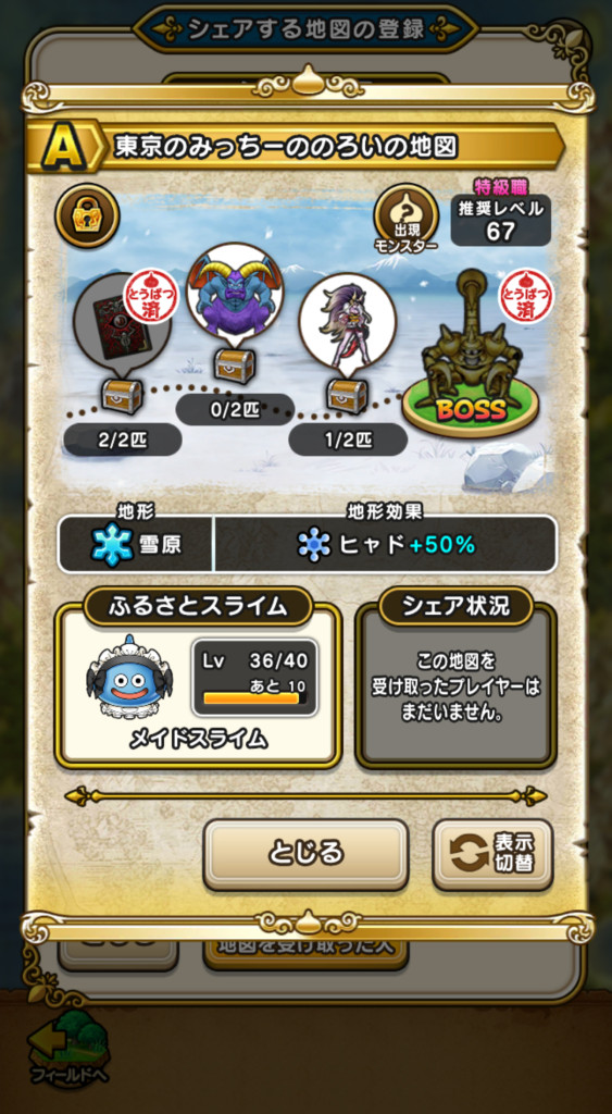 ドラクエウォークの宝の地図をシェア・入手するためのフレンド募集掲示板です。シェア時は宝の地図の内容(グレード、BOSS、お宝モンスター、都道府県)と自分のIDを記載してください。
