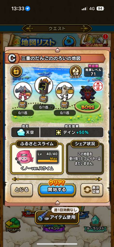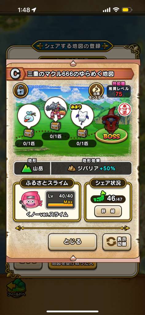 もしすでに宮崎が埋まってたとしても三重のLv75地図はいただきたいのでそのまましばらくシェア継続してくださるとうれしいです