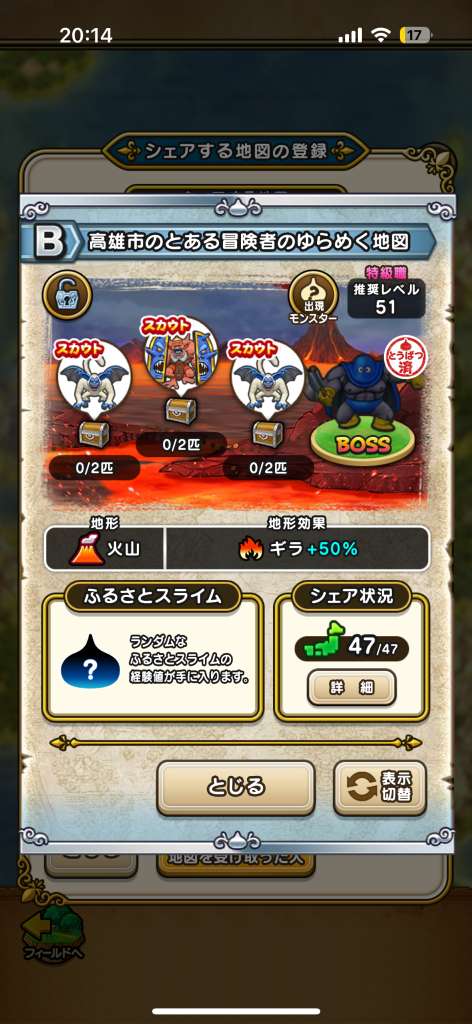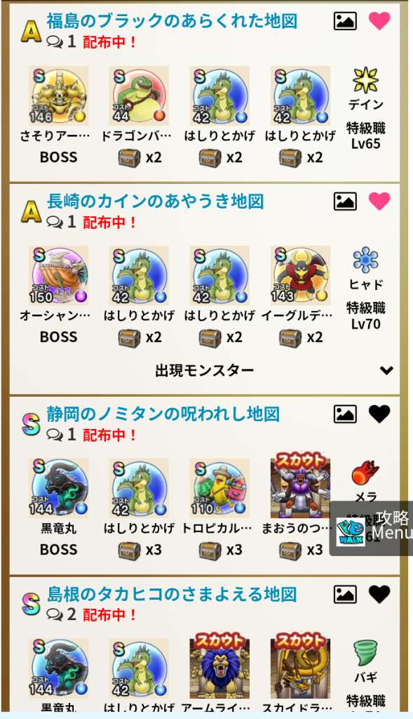 ドラクエウォークの宝の地図をシェア・入手するためのフレンド募集掲示板です。シェア時は宝の地図の内容(グレード、BOSS、お宝モンスター、都道府県)と自分のIDを記載してください。