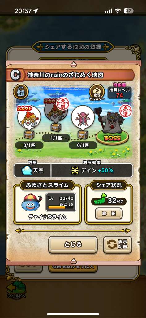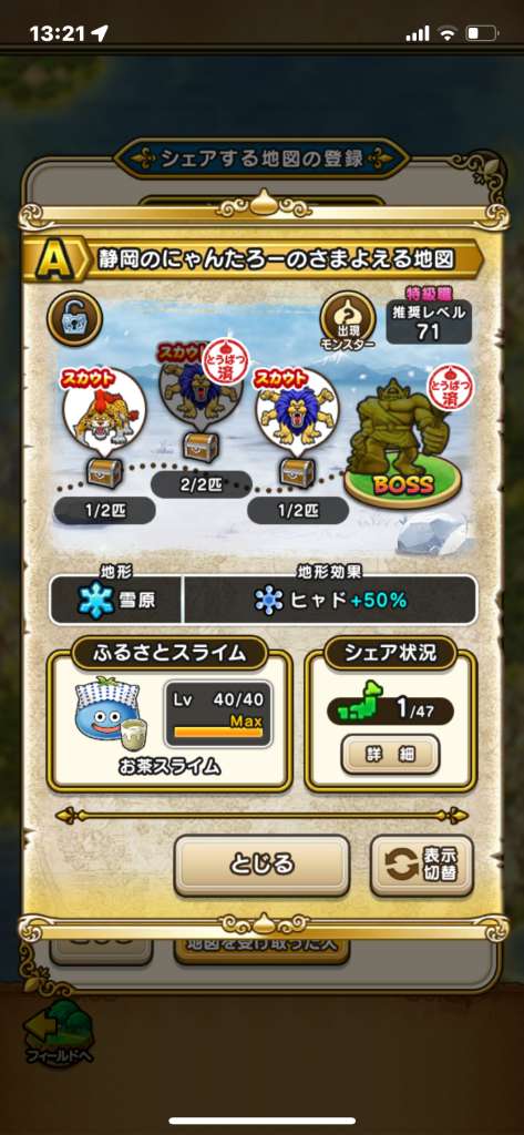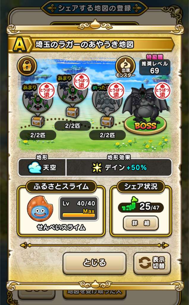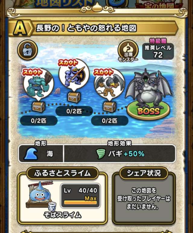 ドラクエウォークの宝の地図をシェア・入手するためのフレンド募集掲示板です。シェア時は宝の地図の内容(グレード、BOSS、お宝モンスター、都道府県)と自分のIDを記載してください。