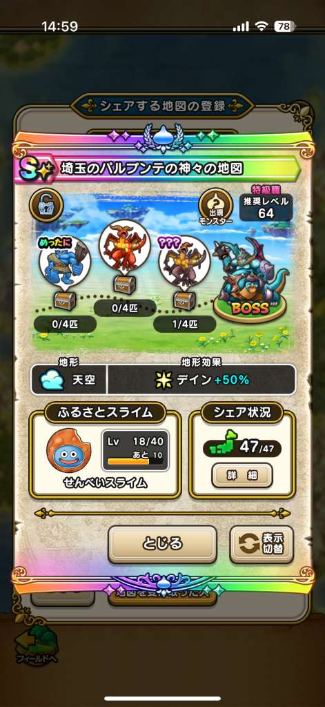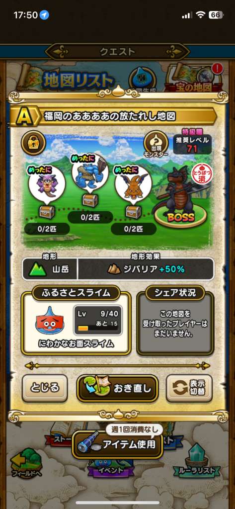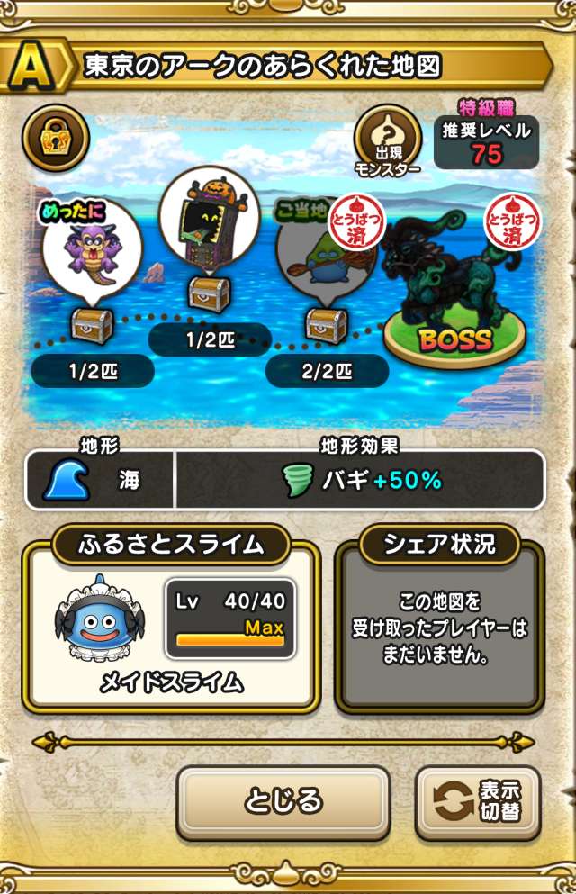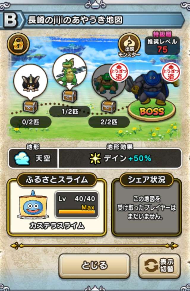 ドラクエウォークの宝の地図をシェア・入手するためのフレンド募集掲示板です。シェア時は宝の地図の内容(グレード、BOSS、お宝モンスター、都道府県)と自分のIDを記載してください。