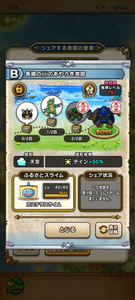 ドラクエウォークの宝の地図をシェア・入手するためのフレンド募集掲示板です。シェア時は宝の地図の内容(グレード、BOSS、お宝モンスター、都道府県)と自分のIDを記載してください。