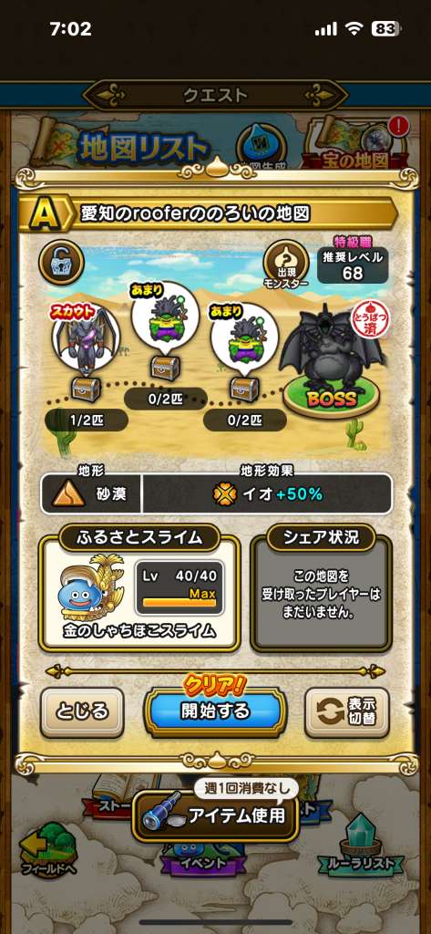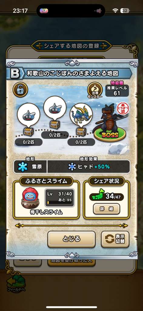 ドラクエウォークの宝の地図をシェア・入手するためのフレンド募集掲示板です。シェア時は宝の地図の内容(グレード、BOSS、お宝モンスター、都道府県)と自分のIDを記載してください。