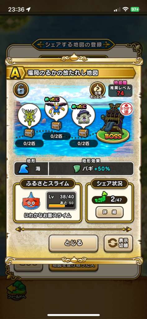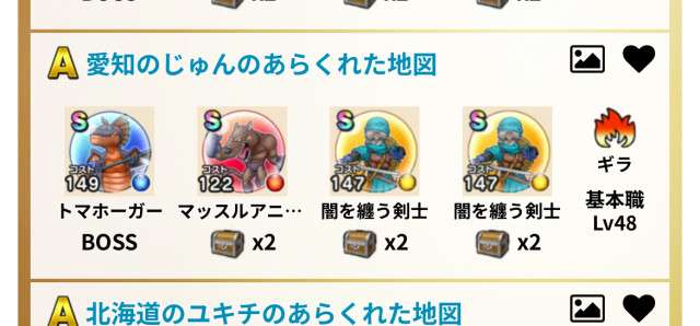 ドラクエウォークの宝の地図をシェア・入手するためのフレンド募集掲示板です。シェア時は宝の地図の内容(グレード、BOSS、お宝モンスター、都道府県)と自分のIDを記載してください。