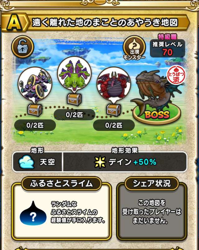 ドラクエウォークの宝の地図をシェア・入手するためのフレンド募集掲示板です。シェア時は宝の地図の内容(グレード、BOSS、お宝モンスター、都道府県)と自分のIDを記載してください。