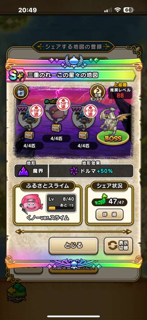 ドラクエウォークの宝の地図をシェア・入手するためのフレンド募集掲示板です。シェア時は宝の地図の内容(グレード、BOSS、お宝モンスター、都道府県)と自分のIDを記載してください。