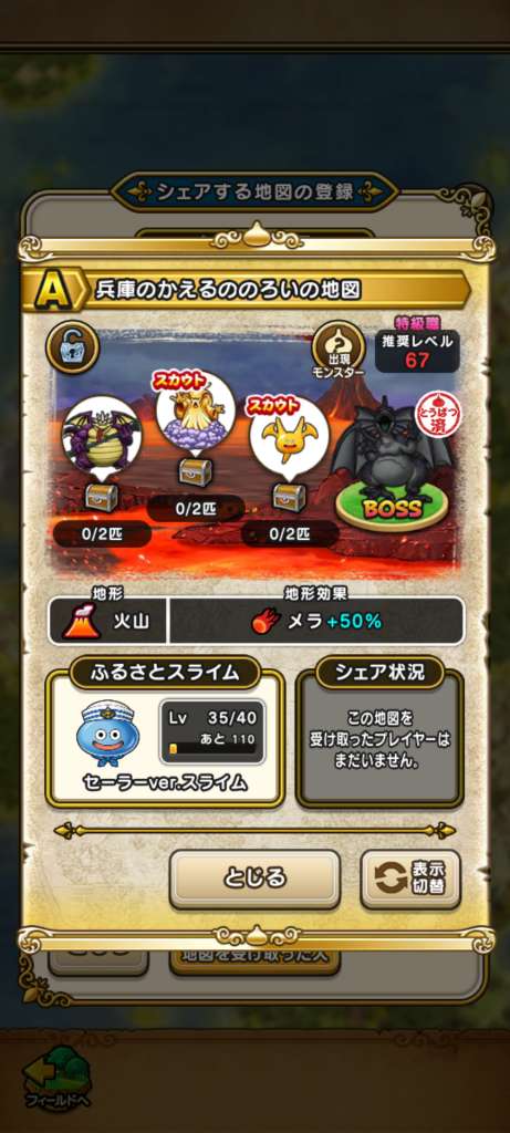 ドラクエウォークの宝の地図をシェア・入手するためのフレンド募集掲示板です。シェア時は宝の地図の内容(グレード、BOSS、お宝モンスター、都道府県)と自分のIDを記載してください。