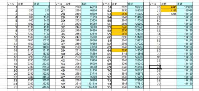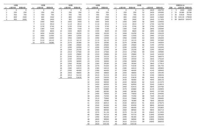 4段階目と5段階目は同じ経験値なので一つにまとめてました。