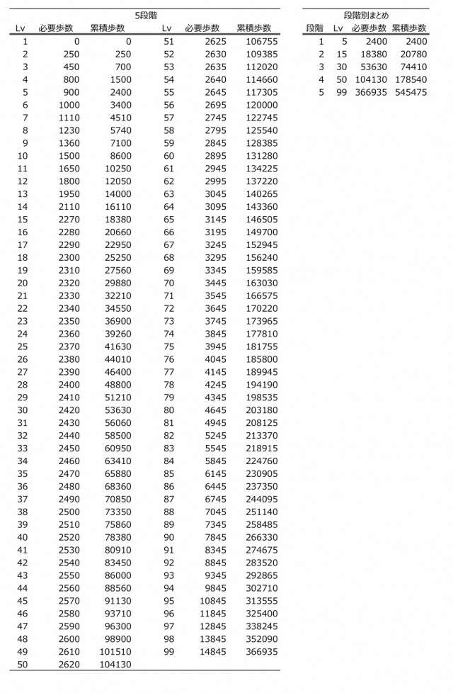 どの段階でもLv毎の必要歩数は同じなので、5段階目の表だけあればいいような気もします。