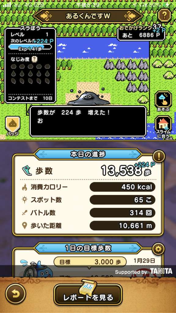 自身の歩いた歩数に応じて、スライムに経験値が入る仕組みです。その経験値を利用することでスライムのレベルが上昇します。