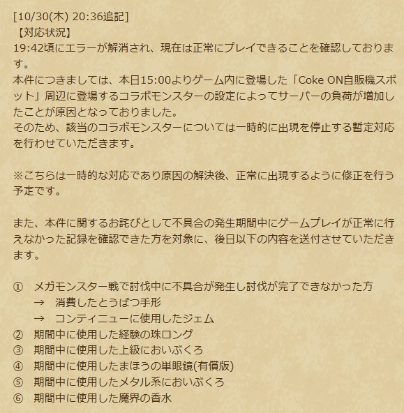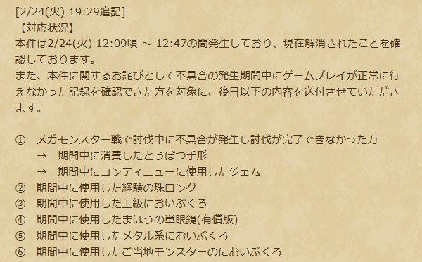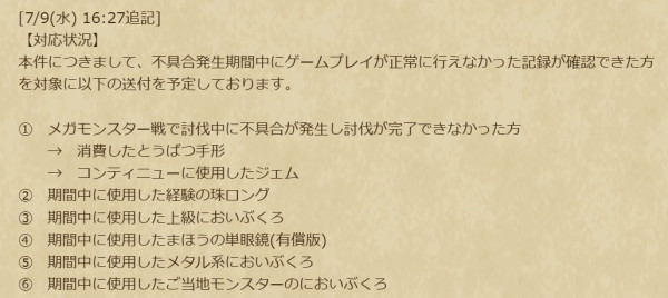 ゲームが正常に遊べなかった方を対象に各種アイテムが配布されます。