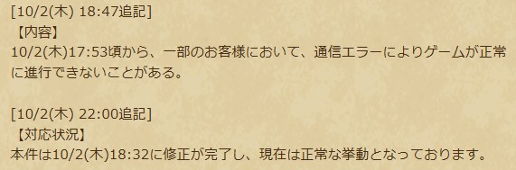 まだお知らせは更新されていませんが、通信エラーが解消されたようです。筆者も通常通りプレイできております。