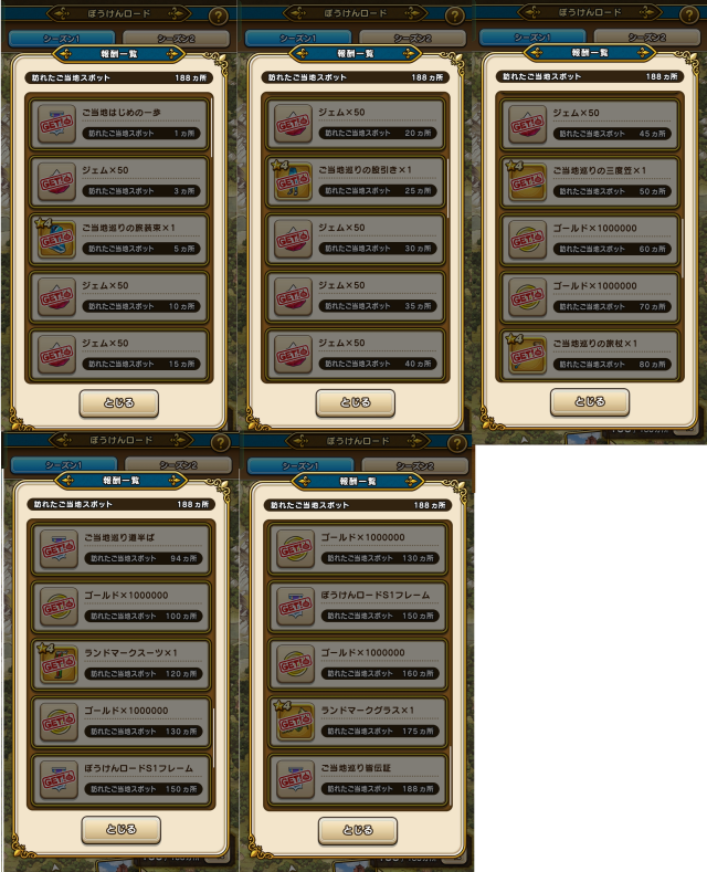 訪れたご当地スポットの数に応じて報酬がもらえる「ぼうけんロード」が追加されます。ジェムや見た目装備、称号など。2025/11/13(木)15:00時点でクリアしているシーズン1の報酬は達成済みになります。