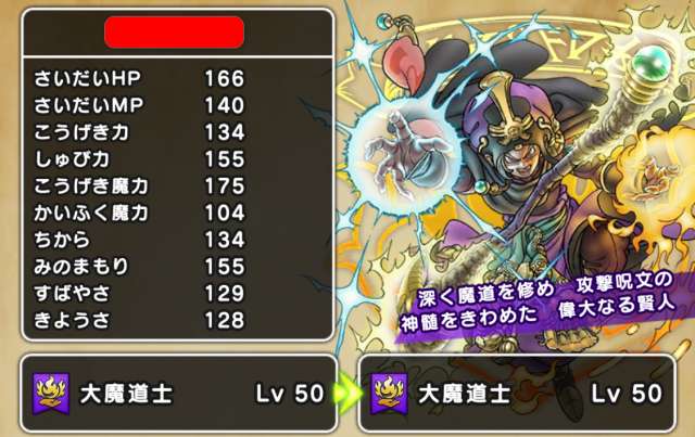 例えば大魔道士の場合は、最大レベル50のステータスのみとなります。